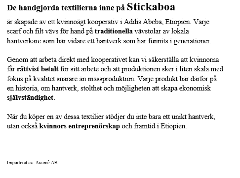 I stickaboa hittar du sjalar vävda av handspunnet silke och filtar i handspunnet bomull. Vill ni hitta flera produkter från detta kvinnokoperativ Salem´s kontakta kontakt@axume.se